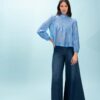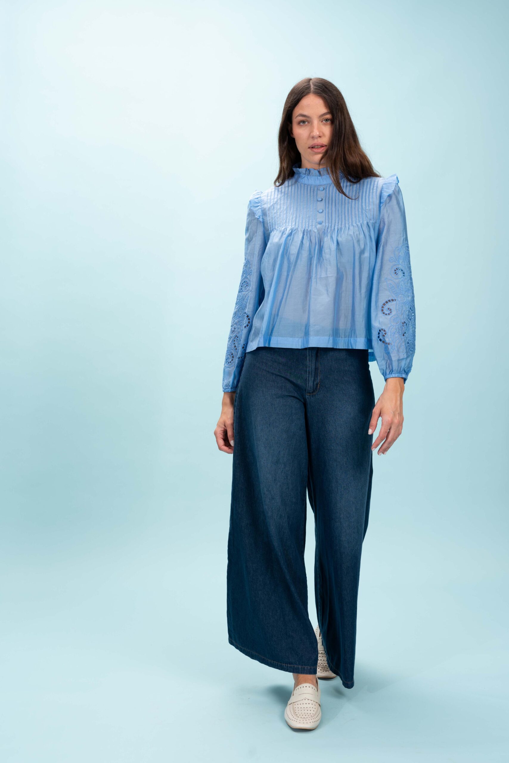 BLUSA DE ALGODON DE SEDA CON ALFORZAS, MANGA CALADA Y BORDADO A TONO. DETALLE DE BOTONES FORRADOS