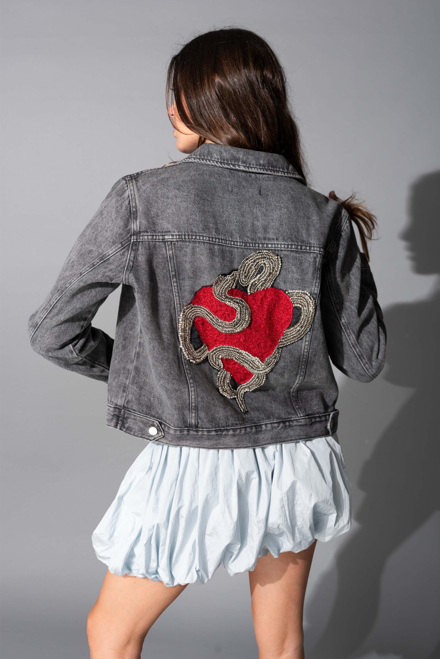 CAMPERA DE JEAN CON FLECOS DELANTEROS Y CORAZON BORDADO INTEGRAMENTE A MANO. LIMITED EDITION BY AMBER LEBON