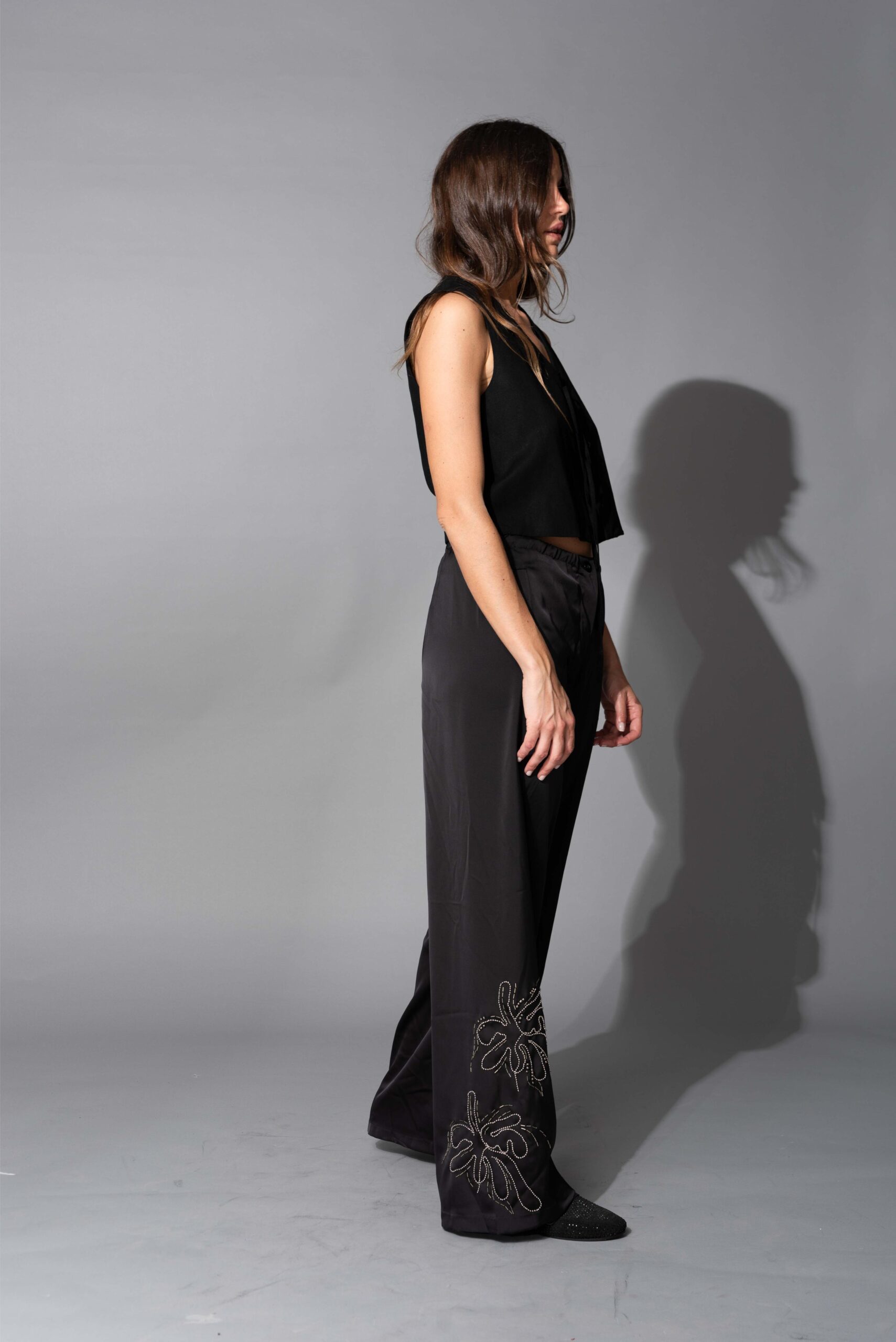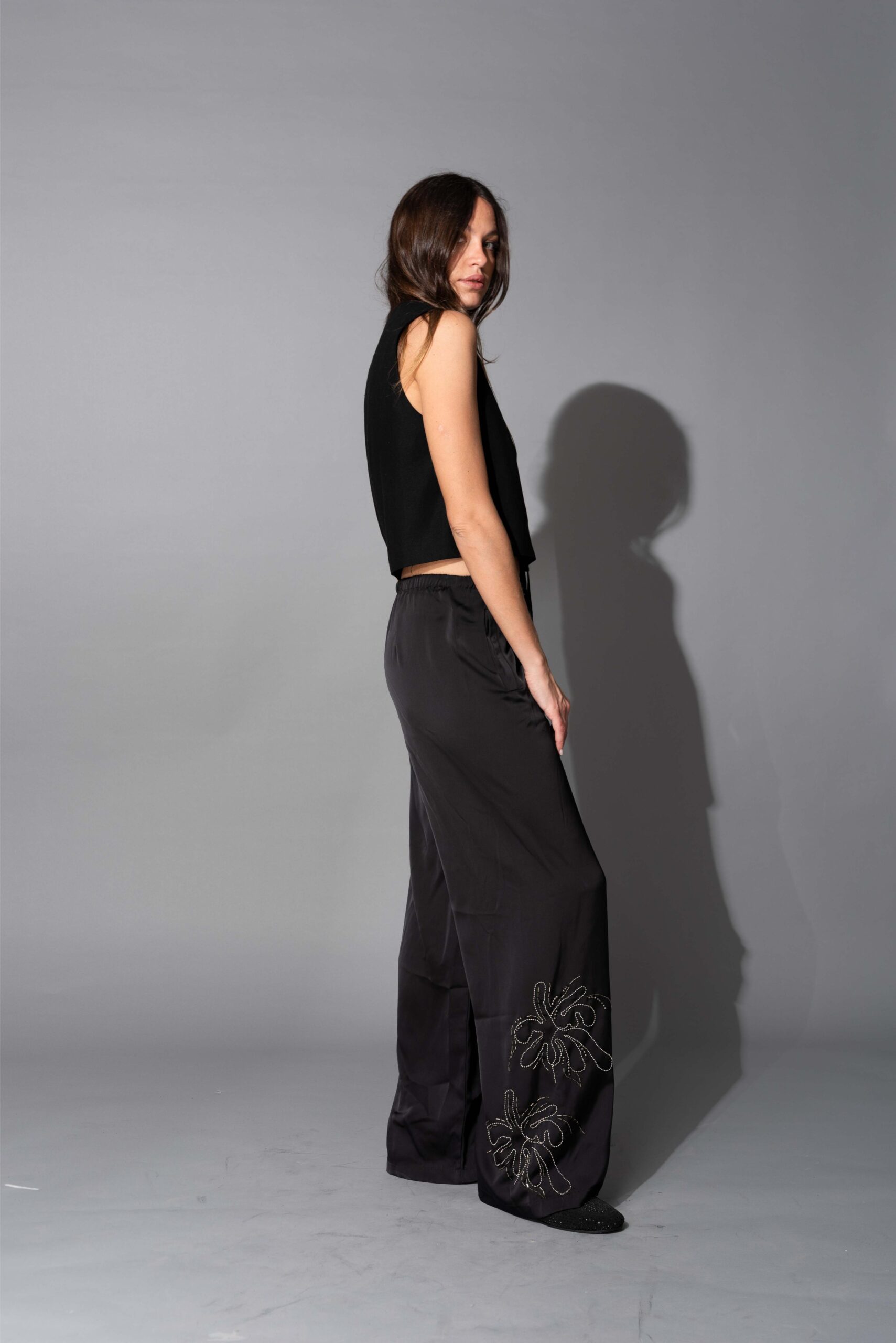 PANTALON DE SATIN DOBLE OPACO CON BORDADO REALIZADO A MANO. LIMITED EDITION BY AMBER LEBON